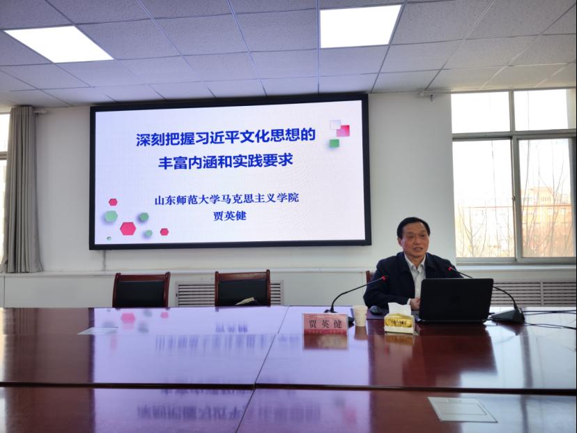 贾英健教授围绕“深刻把握习近平文化思想的丰富内涵和实践要求”,从习近平文化思想的生成逻辑、丰富内涵和实践要求三个方面进行深刻讲解。
