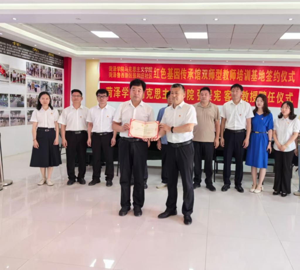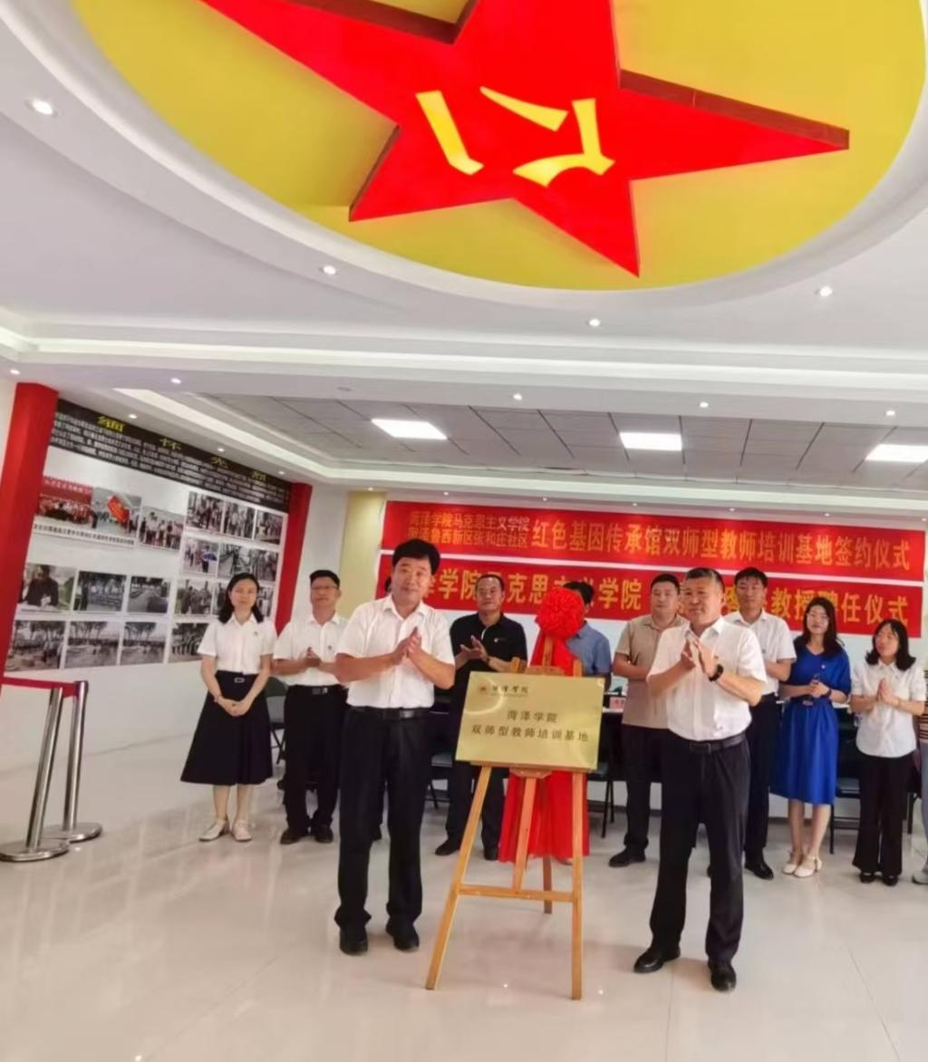 活动现场,陈支庆与张景宪共同为红色基园传承馆“双师型教师培训基地”揭牌。陈支庆指出,学院将通过建立“大格局”、建好“大资源”、建设“大课堂”、建强“大师资”,将红色文化有效融入高校“大思政课”,促进思政课提质增效。张景宪表示,要深化双方合作与交流,共享教育资源,推进红色文化进课堂、进教材、进头脑等工作,做好菏泽红色文化传承与推广工作。