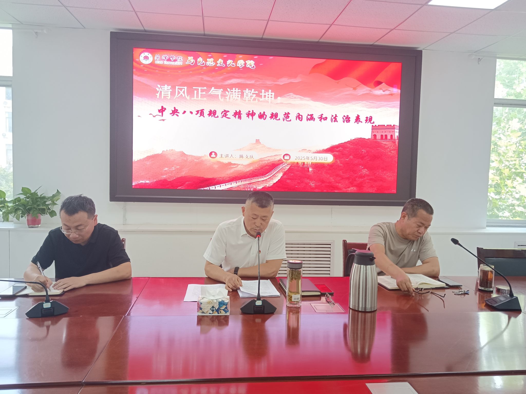 陈支庆从中央八项规定精神的法治定位和中央八项规定精神的规范内涵两个方面,阐释了“中央八项规定精神”的法治释义;从“立信、明矩、铸魂”三个维度,明晰了“中央八项规定精神”的法治表现。陈支庆指出,中央八项规定是长期有效的铁规矩、硬杠杠,全体党员要深入学习习近平总书记关于加强党的作风建设的重要论述,深刻领会中央八项规定及其实施细则精神,不断锤炼党性、提高认识和思想觉悟,打牢思想政治基础。要切实增强贯彻落实的自觉性、主动性,从全面从严党、党的自我革命、党的作风建设和中国特色社会主义法治体系建设等场域做到学思用贯通、知信行统一,把中央八项规定精神转化为思想行动的内在自觉,以党的自我革命精神深入推进党的作风建设,以“抓铁留痕”的过硬工作作风来提升教学、科研、管理和服务的高质量发展效能。