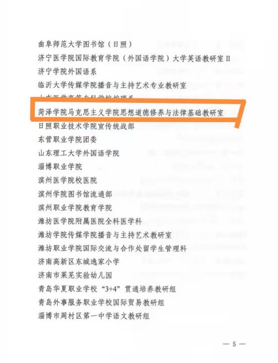 近年来,基础教研室立足应用型高校实际,围绕“立德树人”根本任务,践行“为党育人、为国育才”的使命担当,用“六个要求”明心立志,用“四个自信”强基固本,积极探索思政课教学改革,不断加强自身理论素养,踊跃参加各种技能竞赛,在教学、科研等方面均取得了优异成绩。团队成员中1人获得省级教学成果二等奖、2人获得省高等学校优秀科研成果二三等奖,1人荣获省青年教师多媒体大奖赛一等奖,3人分获菏泽学院青年教师大奖赛一等奖、“课程思政”混合教学比赛一二等奖,1人获得“课程思政”普通话比赛一等奖。另有教师分别获得山东省“理论人才百人工程”、“山东省优秀思政课教师”、菏泽学院“中青年学术骨干”、“十大师德标兵”、“教学名师”、“优秀教师”、“优秀共产党员”、“巾帼建功”十佳岗位明星等荣誉称号。