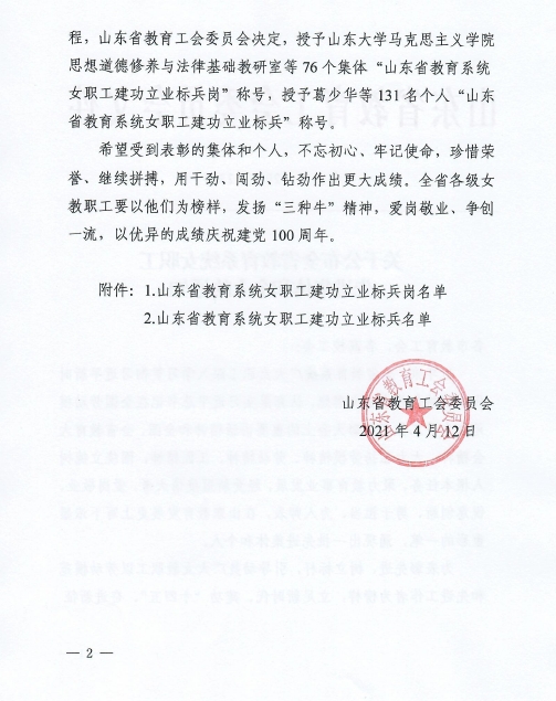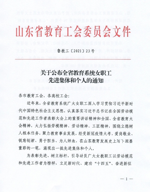 日前,山东省教育工会委员会公布了全省教育系统女职工先进集体和个人的通知,QY球友会体育思想道德修养与法律基础教研室荣获“山东省教育系统女职工建功立业标兵岗”称号。