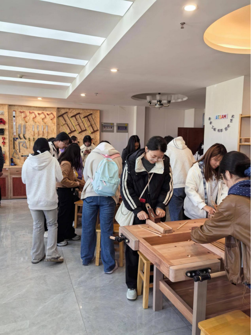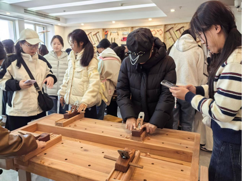 活动伊始,手工坊负责人带领同学们参观,详细介绍了手工坊的布局、内部设置、展示产品及劳动注意事项,让同学们对红木工艺有了初步认识。随后,手工坊老师与崔冬老师共同进行现场教学,指导同学们制作红木筷子。同学们认真听讲,积极动手实践,迅速掌握了刨子、锯子等工具的使用方法,并学会了磨砂打磨技巧。不到一节课的时间,同学们便完成了自己的作品。
