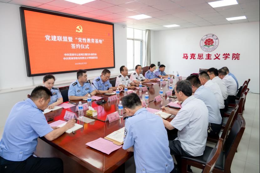 在党的102岁生日到来前夕,2023年6月29日下午,QY球友会体育党委与中共菏泽市公安局交警支队委员会举办共建党建联盟暨“党性教育基地”签仪式菏泽市公安局党委委员、交警支队党委书记、支队长李继德同志菏泽学院安保处处长牛健康、QY球友会体育党委书记陈支庆、院长闫伟及其他领导班子成员、菏泽市公安局交警支队党员、QY球友会体育各党支部委员参加签约仪式。签约仪式由闫伟主持。