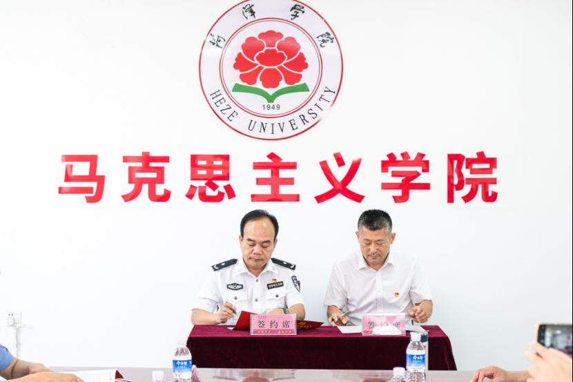 签约仪式中,菏泽市公安局党委委员、交警支队党委书记、支队长李继德同志、QY球友会体育党委书记陈支庆同志签订中共菏泽市公安局交警支队委员会、中共菏泽学院QY球友会体育委员会党建联盟暨“党性教育基地”协议书。
