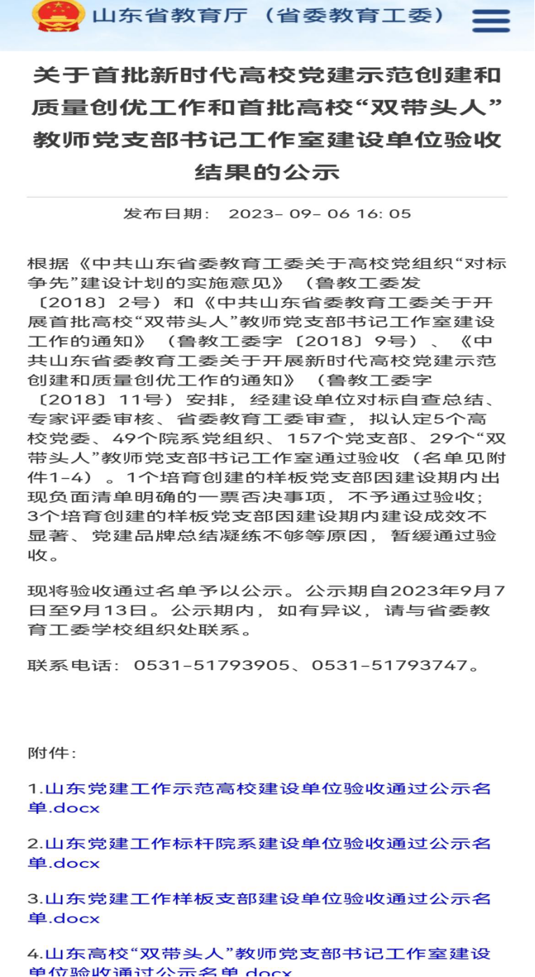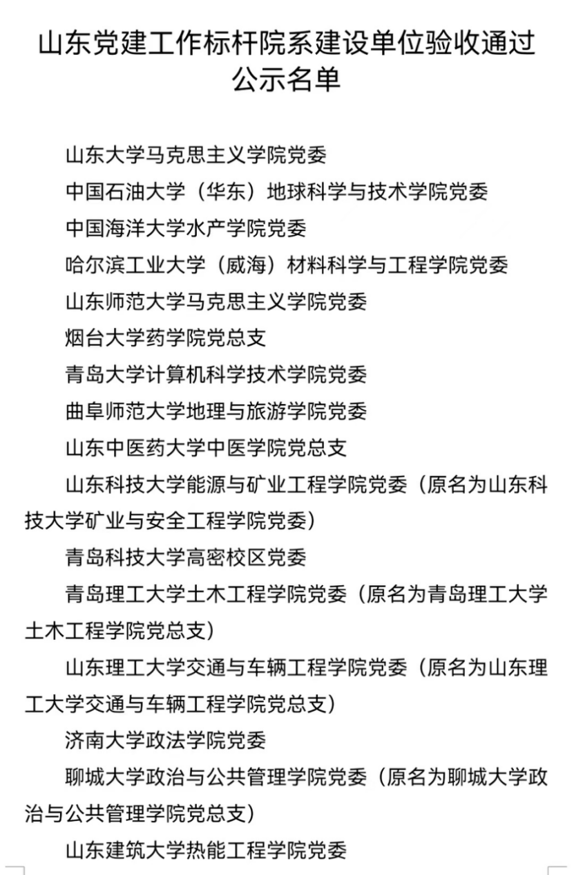 近日,中共山东省委教育工委公布了首批新时代高校党建示范创建和质量创优工作和首批高校“双带头人”教师党支部书记工作室建设单位验收通过名单。QY球友会体育党委顺利通过省级首批党建工作标杆院系验收。本次共有5个高校党委、49个院系党组织、157个党支部、29个“双带头人”教师党支部书记工作室通过验收。