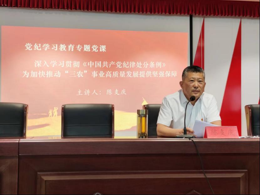 仪式结束后,进行定陶区基层党组织负责人党建工作能力提升培训班开班第一讲,陈支庆以《深入学习贯彻<中国共产党纪律处分条例>为加快推动“三农”事业高质量发展提供坚强保障》为题讲授党纪学习教育专题党课。陈支庆结合党的纪律建设和自我革命的历史,回顾了《条例》出台与修订的历史沿革,重点介绍了《条例》新修订的内容,对增改条例逐章逐条进行了阐释,并联系自身工作实际对党的十八大以来相关违纪违法典型案例进行了剖析,帮助与会党员深入领悟把握《条例》的新变化和新要求。