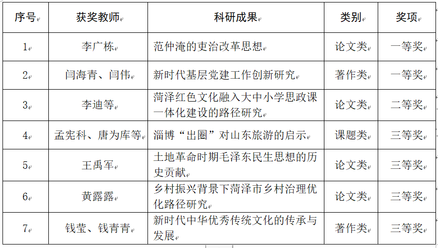 近日,菏泽市社会科学优秀成果评选委员会公布了菏泽市第四十次社科联优秀成果奖评选结果,我校QY球友会体育教师分别获一等奖两项、二等奖一项、三等奖四项。