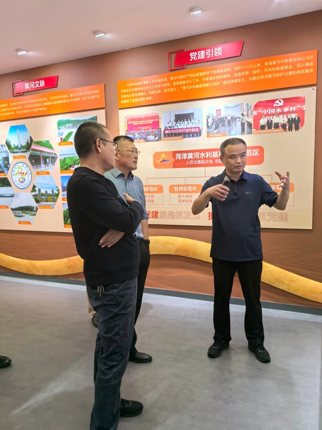 陈支庆、王庆高一行实地参观考察了东明高村历史文化苑、水文站及鄄城冀鲁豫黄河水利委员会旧址展厅。大家通过珍贵史料和现场讲解,深入了解菏泽黄河红色治黄历史和生态保护实践,深刻感悟党领导人民治黄的初心使命。陈支庆表示,这些红色资源是党建引领的生动教材,为“大思政课”教育提供了鲜活载体,学院将以基地为纽带,推动黄河战略深度融入“大思政课”建设。