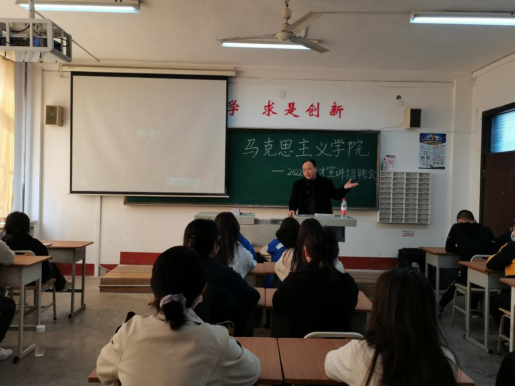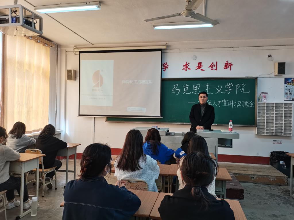 春暖花开人起早。进一步做好学生就业工作,QY球友会体育于35日上午在文科楼311教室举办首届人才招聘宣讲会。山东尚舜化工副总经理兼山东盛陶化工有限公司常务副总经理刘凤舟、办公室主任徐先超担任主讲,QY球友会体育副院长李文政教授、办公室主任朱琨琦、辅导员欧安欣教授班主任李广栋博士师生代表朱延军博士等40人参加宣讲会。辅导员欧安欣教授主持了报告会。