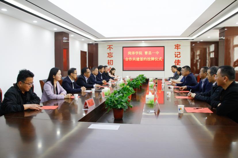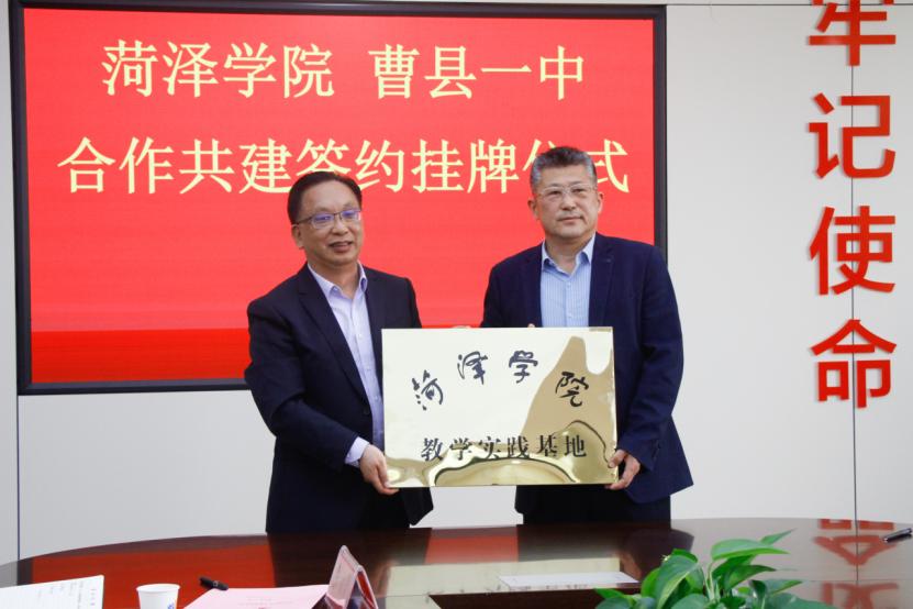 曹县第一中学的交流会上陈支庆则介绍了菏泽学院及菏泽学院QY球友会体育基本情况和办学特色校长张振栋介绍了学校整体情况和学科基地建设情况。会后,双方签署了《校外教学实习基地协议书》,举行了“菏泽学院教学实习基地”揭牌仪式并正式聘请渠月等四位优秀思政课教师作为QY球友会体育的兼职教师。